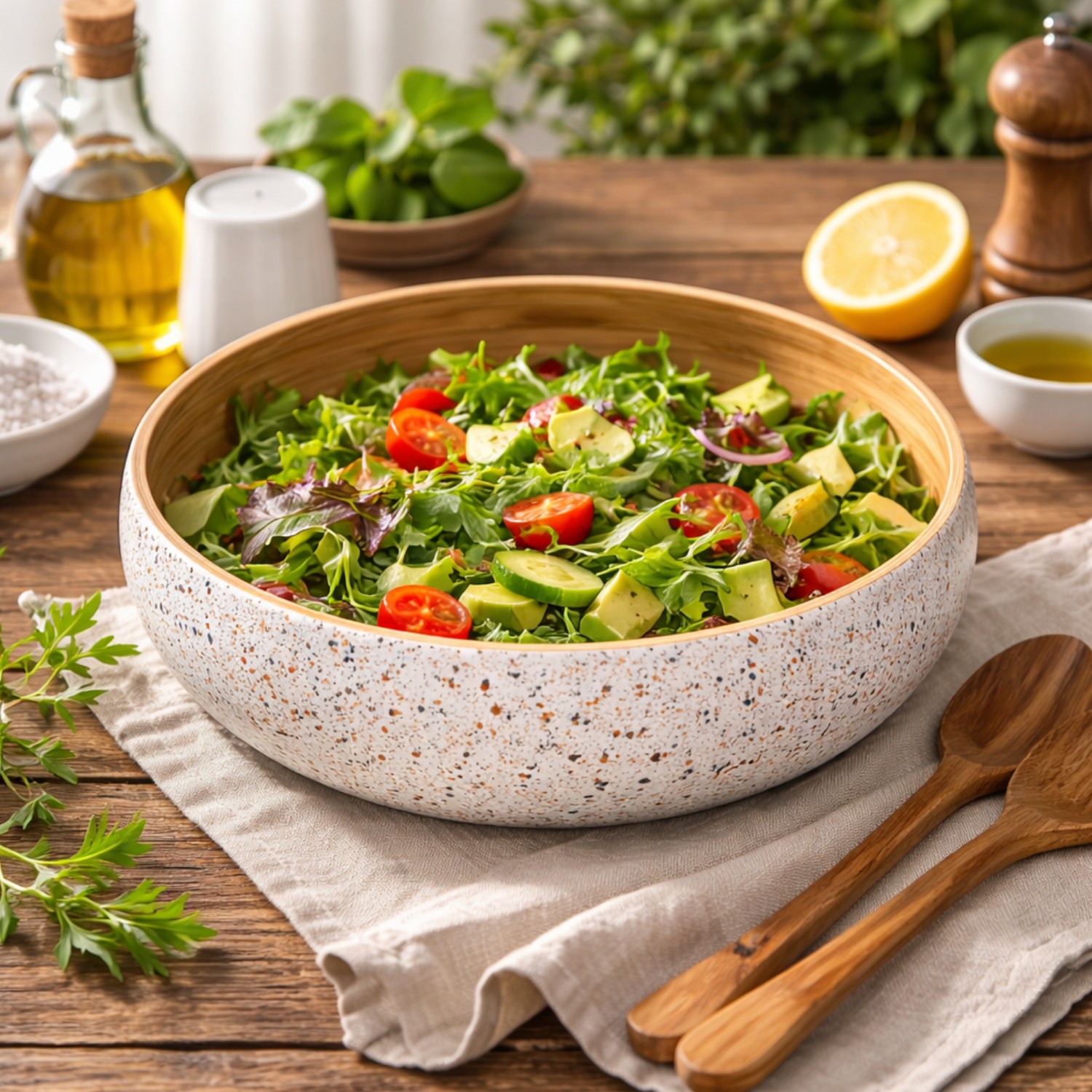 Bring natural elegance to your table with this spun bamboo salad bowl, designed with a smooth, food-safe interior and a stylish speckled finish. Lightweight yet durable, it’s ideal for serving salads, fruits, or snacks while adding a warm, eco-friendly touch to any kitchen or dining setting.